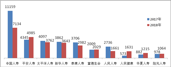 人身保险公司合同纠纷投诉量居前10位的为:中国人寿7134件,同比下降36.07%;平安人寿4985件,同比增长14.73%;太平洋人寿3762件,同比下降8.18%;新华人寿3643件,同比下降5.67%;泰康人寿2982件,同比下降19.54%;富德生命2029件,同比增长1.00%;人民人寿1661件,同比下降39.29%;人民健康1631件,同比增长184.64%;华夏人寿1215件,同比增长37.76%;阳光人寿1064件,同比增长8.79%。