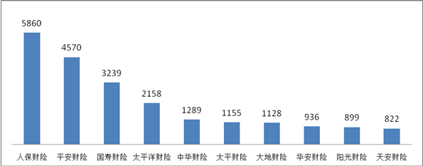 财产保险公司机动车辆保险理赔纠纷投诉量居前10位的为:人保财险5860件,同比下降18.17%;平安财险4570件,同比下降5.71%;国寿财险3239件,同比增长11.04%;太平洋财险2158件,同比下降3.70%;中华财险1289件,同比下降49.61%;太平财险1155件,同比下降25.00%;大地财险1128件,同比增长33.65%;华安财险936件,同比增长12.10%;阳光财险899件,同比下降13.89%;天安财险822件,同比下降0.12%。