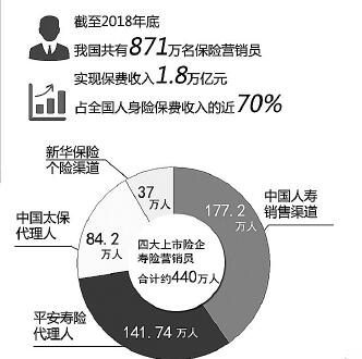 在保险行业的发展过程中,营销员扮演了至关重要的角色,是推进行业发展不可或缺的中坚力量。自2015年取消保险营销员考试准入门槛后,我国保险营销员数量出现了猛增。截至2018年年底,我国共有871万名保险营销员,实现保费收入1.8万亿元,占全国人身险保费收入的近70%。