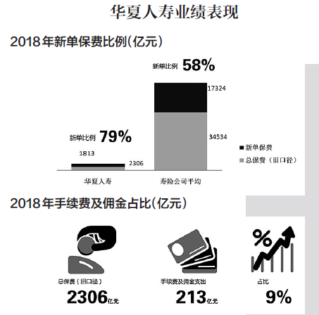 由华夏人寿公布的业绩情况不难看出,2018年,在公司2306亿元的总保费收入中,续期保费收入已达493亿元,新单业务保费收入为1813亿元,新单保费占总保费收入比例高达79%,较其他上市寿险公司高出50~59个百分点,高于行业平均水平21个百分点。而恰恰是因为新单业务的手续费及佣金支出远高于续期保险业务的该项支出,所以才导致公司的手续费及佣金占比高于行业平均水平。