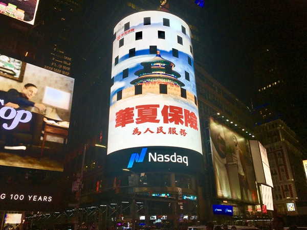 华夏保险登陆“世界第一大屏”——美国纽约时代广场纳斯达克广告牌。中国形象,让世界看见。
