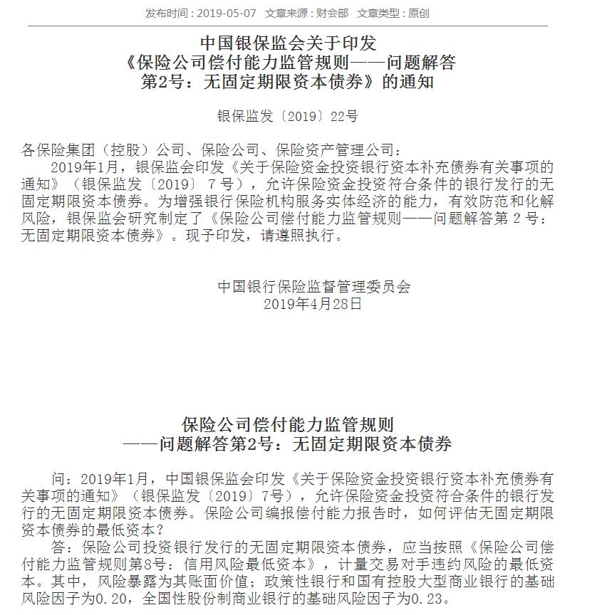 银保监会:保险公司投资银行发行的无固定期限资本债券,应当按照《保险公司偿付能力监管规则第8号:信用风险最低资本》,计量交易对手违约风险的最低资本。其中,风险暴露为其账面价值;政策性银行和国有控股大型商业银行的基础风险因子为0.20,全国性股份制商业银行的基础风险因子为0.23。