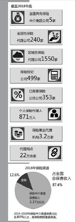 数据显示,截至2018年底,全国共有保险中介集团公司5家,全国性保险代理公司240家,区域性保险代理公司1550家,保险经纪公司499家,已备案保险公估公司353家,个人保险代理人871万人,保险兼业代理机构3.2万家,代理网点22万余家。2018年,保险中介渠道实现保费收入3.37万亿元,占全国总保费收入的87.4%。近5年保险中介渠道保费占比始终在80%以上,是保险销售的重要渠道。