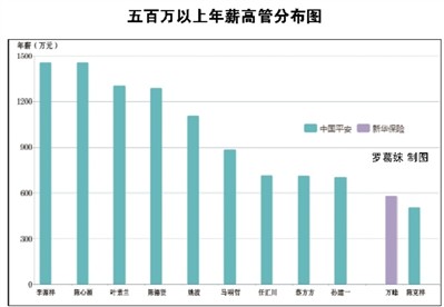 年薪在500万元以上的高管人员,共11名,中国平安再次霸占10个席位。新华保险原首席执行官、原首席风险官、原董事长万峰,则以年薪581.79万元成功挤入前十强,也是唯一一个500万年薪的“非平安高管”。