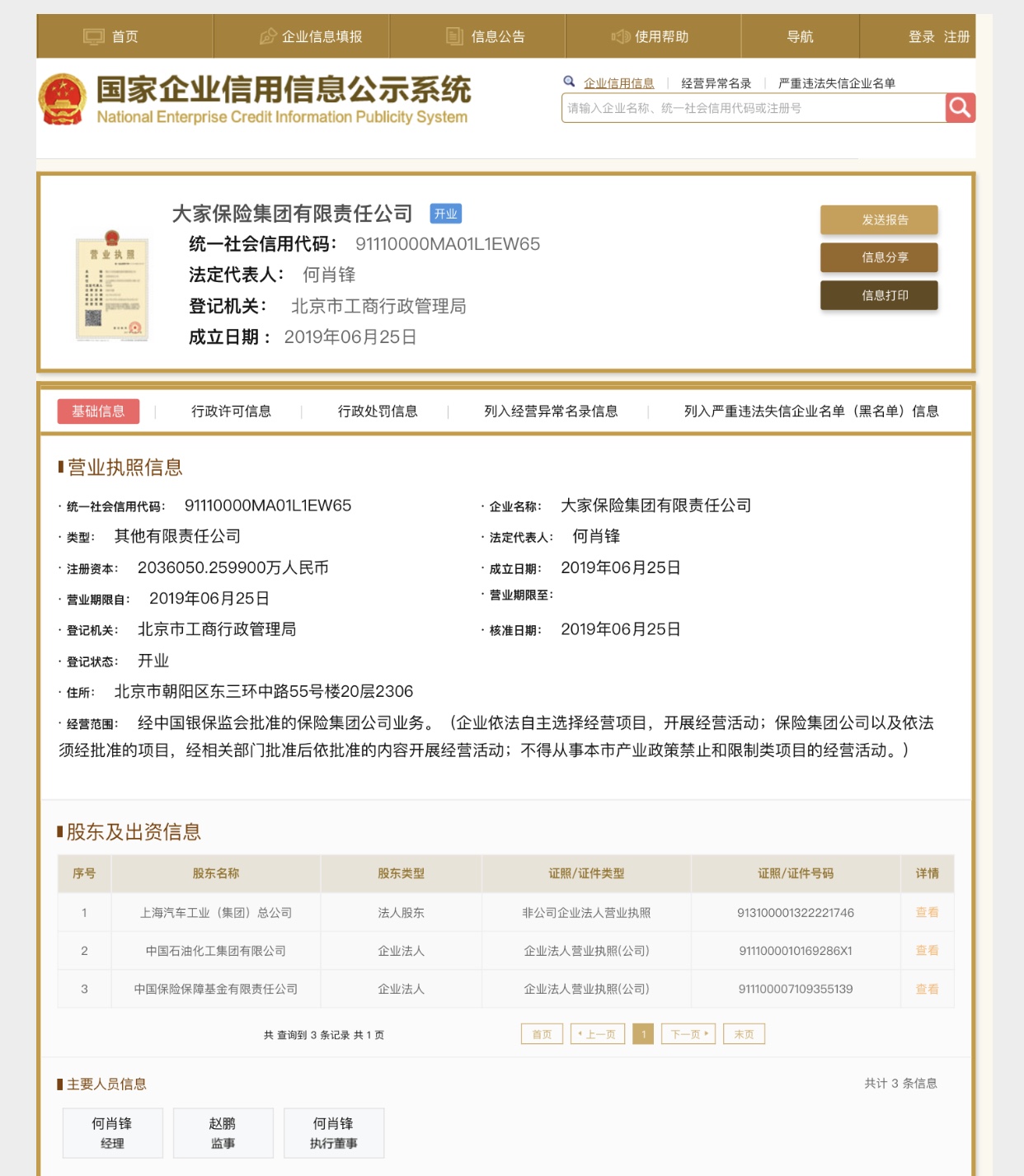 上证报中国证券网讯 国家企业信用信息公示系统官网显示,一家名为“大家保险集团有限责任公司”的保险机构于2019年6月25日成立,注册资本为2036050.259900万元,法定代表人为何肖锋,住所为北京市朝阳区东三环中路55号楼20层2306。