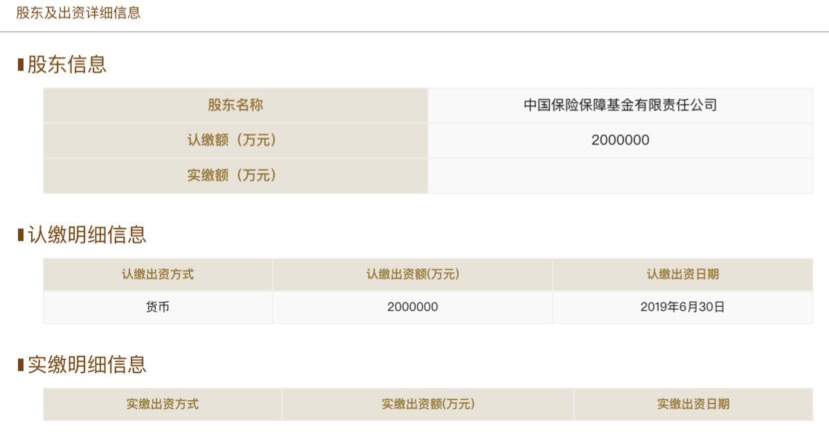 从股东及出资信息一栏可见,大家保险集团共有三个股东:中国保险保障基金有限责任公司为最大股东,认缴金额为200亿元;上海汽车工业(集团)总公司认缴金额为24932.5703万元;中国石油化工集团有限公司认缴金额为11117.6896万元。三个股东认缴出资方式均为货币,认缴出资日期均为2019年6月30日。
