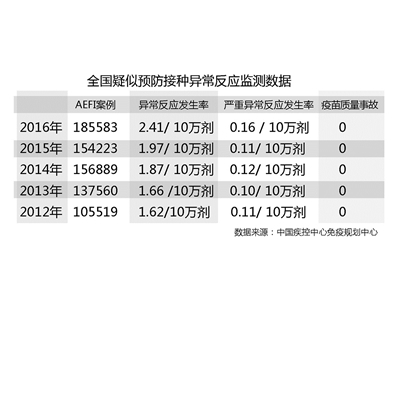 根据中国疾控中心免疫规划中心相关数据,2012年至2016年间,疫苗质量事故造成的AEFI报告例数均为零,而因严重异常反应导致的接种者致残案例却时有发生。总体而言,我国疫苗质量很安全,造成预防接种不良事件的概率很低,但确实会有小比例人群在接种质量合格的疫苗时产生不良反应。