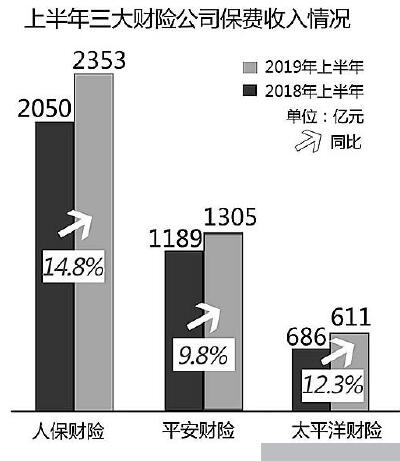 今年上半年,在产险方面,三大财险公司整体呈现出较快增速。人保财险保费居首,同比增长14.92%至2353.35亿元;平安财险保费收入实现1304.66亿元,同比增长9.75%;太保财险保费收入为685.98亿元,同比增长12.28%。