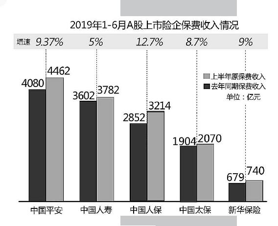 数据显示,2019年上半年,A股五大上市险企共实现原保费收入14268.42亿元,同比增长9%。中国人寿、中国平安、中国太保、中国人保、新华保险累计原保费收入分别为3782亿元、4462.4亿元、2070.3亿元、3213.82亿元、739.9亿元,同比增速分别为5%、9.4%、8.7%、12.7%、9%。
