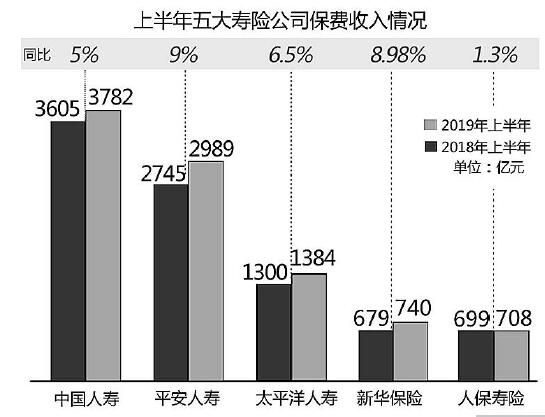 今年上半年,五大上市险企的业绩表现各有千秋,亮点频现。具体来看,中国平安以4462.4亿元保费收入仍居于首位;中国人保保费收入为3213.82亿元,同比增长12.7%,增速居首,与第二名中国人寿的保费收入差距由2018年上半年的750亿元缩减至今年上半年的568.18亿元。中国太保、新华保险上半年保费收入分别为2070.3亿元和739.9亿元。