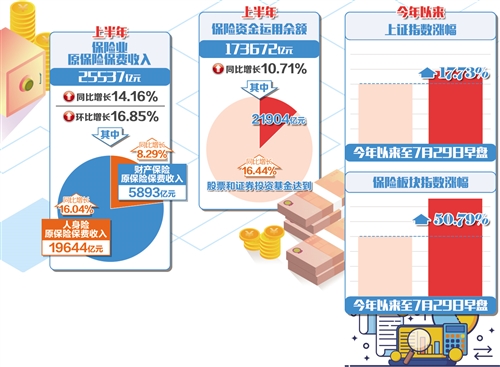 保险对经济的支持和保障还体现在赔付支出方面。上半年保险业原保险赔付支出6232亿元,同比增长4.07%,其中财产险赔付支出2918亿元,同比增长11.01%。人身险中的健康险和意外伤害险赔付支出分别为1020亿元、143亿元,同比增长36.91%和14.58%。