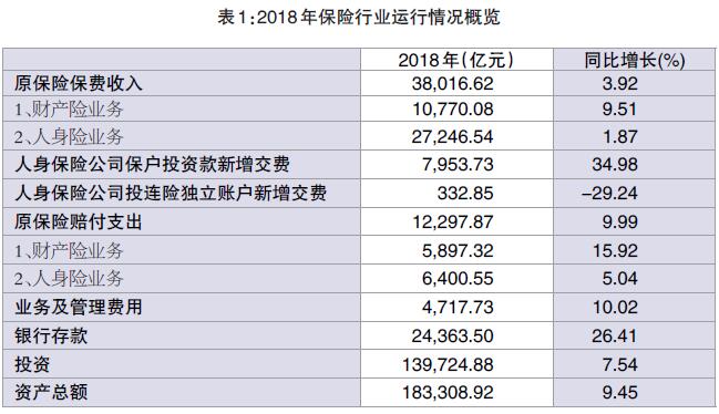 2018年,保险行业回归本源,业务结构转型优化,实现原保险保费收入3.80万亿元,同比增长3.92%;资产规模平稳增长,年末总资产18.33万亿元,净资产2.02万亿元;助力经济社会发展大局,保险保障功能不断增强,为全社会提供保险金额6897.04万亿元,同比增长66.23%;市场主体日趋丰富,行业偿付能力充足稳定;消费者权益保护力度持续加强,2018年中国保险消费者信心指数为71.9,显示保险消费者信心稳定乐观(见表1)。