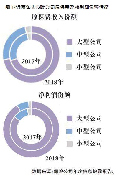 1.人身险业务转型仍处攻坚期。人身险行业转型取得阶段性成果,同时也进入攻坚期和深水区。改革触及的问题由浅入深,部分公司发展方式尚未由高速度增长向高质量发展转变,经营理念尚未由以业务规模为中心向以价值贡献为中心转变,产品战略尚未由粗放开发、盲目跟随市场向以消费者需求为主导的创新发展转变。当前人身险市场马太效应明显,2018年,9家总资产在3000亿元以上的大型公司合计原保费收入占比71.89%,同比上升1.56个百分点;净利润占比94.54%,同比上升3.63个百分点。中小公司在外部竞争和内部经营双重压力下面临转型难、生存难问题。同时,主要业务渠道发展承压,个险渠道人均产能下滑、人力规模增速放缓,银邮渠道销售长期期交产品难度较大(见图1)。