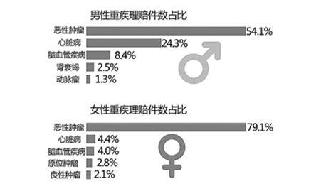 从理赔总体情况来看,恶性肿瘤是大众健康面临的头号杀手,对于男性而言,理赔前三位的恶性肿瘤为甲状腺癌、肺癌、肝癌;对于女性而言,分别为甲状腺癌、乳腺癌和肺癌。其次是急性心肌梗死、脑中风后遗症、终末期肾病。90%的重疾险理赔都是由于恶性肿瘤和心血管疾病,而这些都包含在中国保险行业协会规定的重疾险必保的25种重大疾病中。