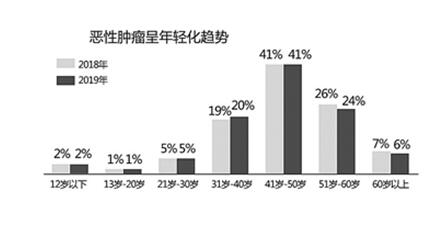 泰康人寿的数据也显示,恶性肿瘤呈年轻化趋势。从该公司2019年上半年恶性肿瘤出险率来看,41到50岁这一年龄段最高,达到41%。另外,在所有年龄段中,除了31到40岁这一年龄段出险率比去年同期提高1个百分点达到20%以外,其他年龄段出险率均未高于去年。