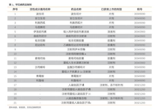 天风证券研报显示,在我国上市的罕见病药品制剂目录涉及生长激素、人凝血因子VIII等多种生物制品或药品,建议投资者关注长春高新,其为生长激素龙头企业,生长激素持续保持高速增长;同时关注涉及生长激素的企业安科生物,以及涉及人凝血因子VIII的企业华兰生物;适当关注人凝血因子VIII处于审评审批中的博雅生物。(潘宇静)
