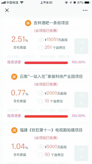 另外一家“祥钰德”的投资利率更高,该公司网络平台展示的多个项目均按日化利率进行计算,日化收益为0.56%-2.5%不等,例如投资项目“吉林酒吧一条街”,标明日化收益高达2.51%,折合年化收益就是916.15%。