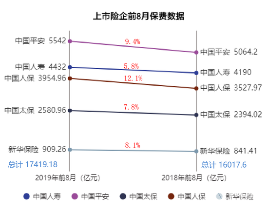 截至9月17日,A股五大上市险企悉数披露前八月保费收入,据《每日经济新闻》记者统计,中国平安、中国人寿、中国人保、中国太保、新华保险合计实现保费收入1.74万亿元,同比增长8.8%。