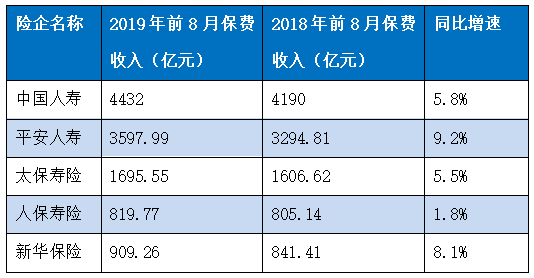 根据各家险企披露的保费数据,中国平安实现原保险保费收入5542亿元,同比增长9.4%;中国人寿实现原保险保费收入4432亿元,同比增长5.8%;中国人保实现原保险保费收入3954.96亿元,同比增长12.1%;中国太保实现原保险保费收入2580.96亿元,同比增长7.8%;新华保险实现原保险保费收入909.26亿元,同比增长8.1%。