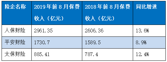 与寿险业务相比,上市财险公司保费增速较为平稳。2019年1—8月,人保财险、平安产险、太保财险分别实现原保险保费收入2961.35亿元、1730.7亿元、885.41亿元,同比增长13.6%、8.9%、12.4%。