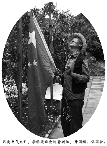 李学亮从宣誓入党的那天起,就决心用一辈子的忠诚追随党,为党工作一辈子、奉献一辈子。山上没有水、没有电、没有路,只有几间土坯房,生活用水必须到山下拉,做饭和照明靠白天蓄积的太阳能,晚上在漆黑孤寂的大山里,躺在透风的小屋里,只有一台收音机陪伴他,通过收音机聆听党中央的声音,了解国家大事,这个习惯保持至今。他在山上的土坯房前立了两根旗杆,一面挂党旗、一面挂国旗,只要天气允许,老李就会迎着朝阳,升国旗、唱国歌。老李说,看到党旗国旗,就时刻提醒自己是一名共产党员;唱着国歌,就与党和国家心连心。