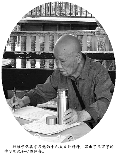 孙维学在日常生活中做到三个必须:每天的新闻联播必须看;中央的大政方针必须学;与党中央不一致的言行必须抵制。党的十九大召开后,孙维学由衷地感到高兴,他废寝忘食,认真学习十九大文件精神,写出了几万字的学习笔记和心得体会。孙维学还结合自身参加革命工作经历,撰写了《永远跟党走》的长篇纪实文学,他总说,作为一名老党员,要做到离岗不离党,退休不褪色。今年4月份老伴去世后,他交待家人要在他死后帮他一次性交纳十万元党费,作为人生最后一次党费交给组织,要把所有有用的器官都捐给需要的人,丧事从简,骨灰深埋不立碑。