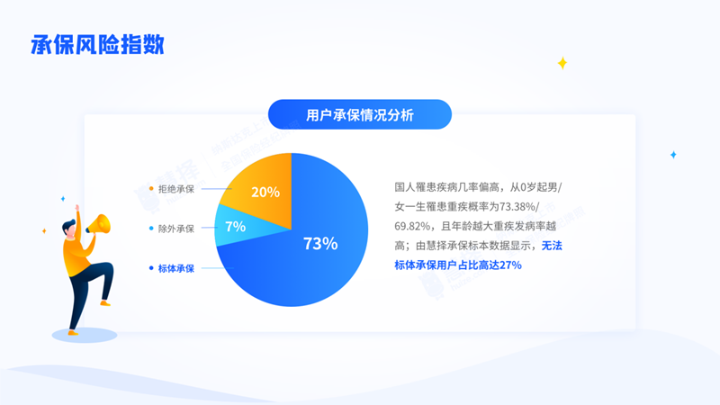 以金融知识储备和风险意识为基础,年轻群体对商业保险的接受程度远超父母辈,对选购保险的偏好网感更强。从慧择线上数据来看,投保人年龄来看年轻化趋势显著,奋斗中的80、90 后“用力青年”正处于人生起飞的重要阶段,一方面工作压力大,作息及饮食习惯不规律;另一方面刚组建家庭的他们几乎同时接手了照顾父母及子女的责任,重压之下身体健康情况不容乐观。“90后不敢看体检报告”并非只是话题梗,心脑血管疾病已经成为当代中青年人群出险率最高的重疾,熬夜、饮食不均衡、运动少、压力大、吸烟等都是危害心血管疾病的重要因素,《报告》数据显示,目前无法标体承保的用户已到达27%。
