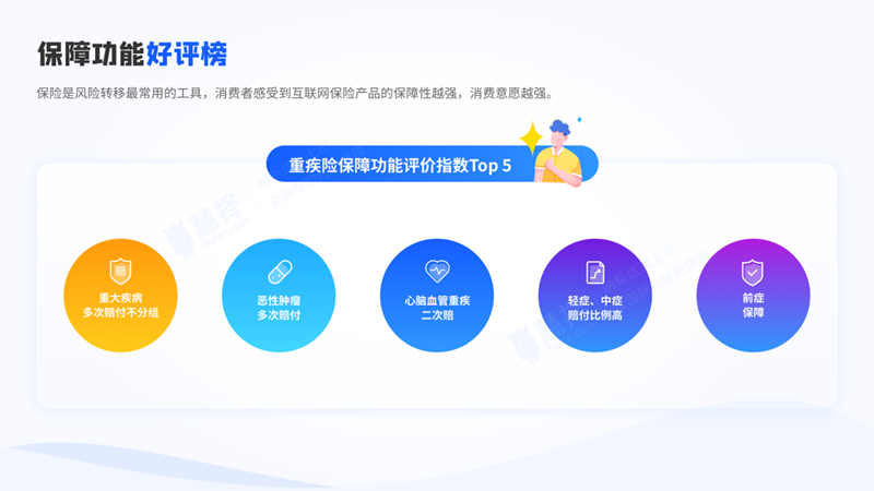 单次重疾是最早的重疾险产品形态,而后市场上又出现了重疾多次赔付的重疾险产品以及特定疾病高发二次赔产品,近几年重疾险在产品形态和保障功能上做了很多创新,互联网产品创新更为丰富,消费者选择更多了,但如何分辨实用创新和噱头戏码成为了新难题。《报告》中的“保障功能好评榜”显示,在重疾险的保障功能中,重大疾病多次赔不分组、恶性肿瘤多次赔付、心脑血管重疾二次赔是如今消费者最关注的三个保障。
