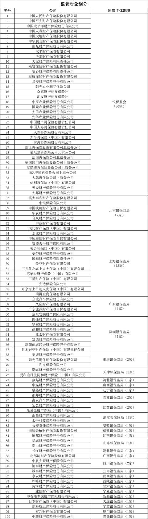 具体来看,方案提出了审慎监管、风险监管、分类监管、联动监管等四项基本原则。在监管对象划分方面,除中国出口信用保险公司外,87家财产保险公司和13家再保险公司划分为银保监会直接监管和银保监局属地监管两类。其中,银保监会直接监管公司36家,银保监局属地监管公司64家。具体划分如下表。