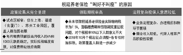 政策出台前调研10年,20多家保险公司参与,三地同时试点,运行以来热度虽高,但“叫好不叫座”,税延养老保险的销售情况与市场预期存在较大差距。一些试点地区的税延养老保险保费收入才20几万元,甚至出现大部分保单内部员工购买的情况。揭开试点“成绩单”,这份暗淡的业绩让曾经抱有美好预期的业界人士“大跌眼镜”。