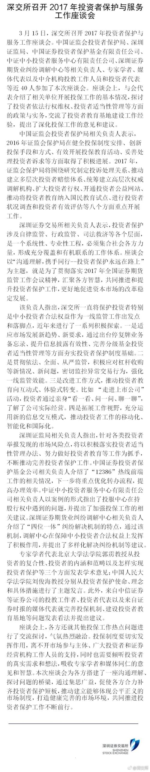 3月15日,深交所召开2017年投资者保护欲服务工作座谈会。中国证监会投资者保护局相关负责人表示,2017年证监会保护局将围绕研究制定投诉处理关系、推动建立多层次投资者赔偿体系、统筹建立高层次权威调解机构、扩大投资者行权、开通投资者公益网站推动将投资者教育纳入国民教育试点、进行投资者状况调查和投资者有效评估等八个方面重点开展工作。
