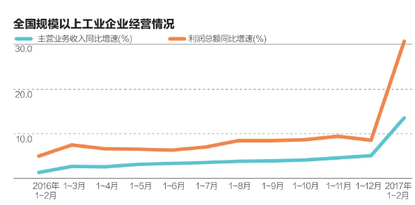 官方数据显示,今年前两月,国有及国有控股企业利润同比增长40.3%;全国规模以上工业企业利润总额同比大涨31.5%。对此,万博新经济研究院新供给经济学研究中心主任刘哲对第一财经记者表示,利润大幅增长主要因为去产能带来的价格上涨和补库存周期带来产量提升,预计短期内利润仍会继续改善。