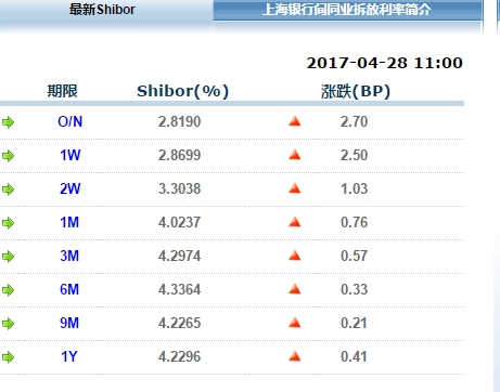 4月28日消息,Shibor连续8日全线上涨,隔夜shibor升至2.819%,上涨2.70个基点,短期借款成本创2015年4月3日以来新高。