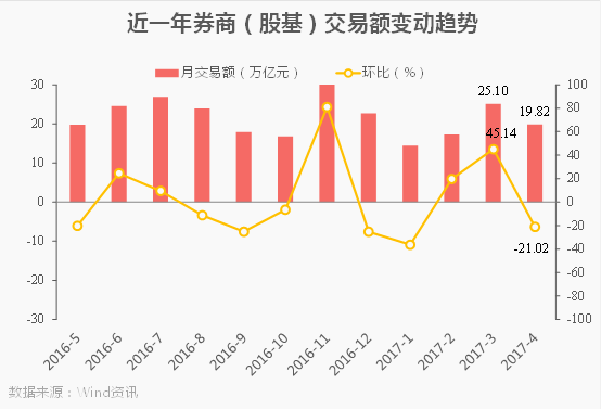 最近一年中,券商股基成交额除2016年6、7、11月和2017年2月、3月环比上升外,其余7个月均环比下降。
