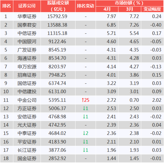 前十名较3月份未发生变化。华泰证券以约1.58万亿股基成交额,7.97%的市场份额蝉联第一。