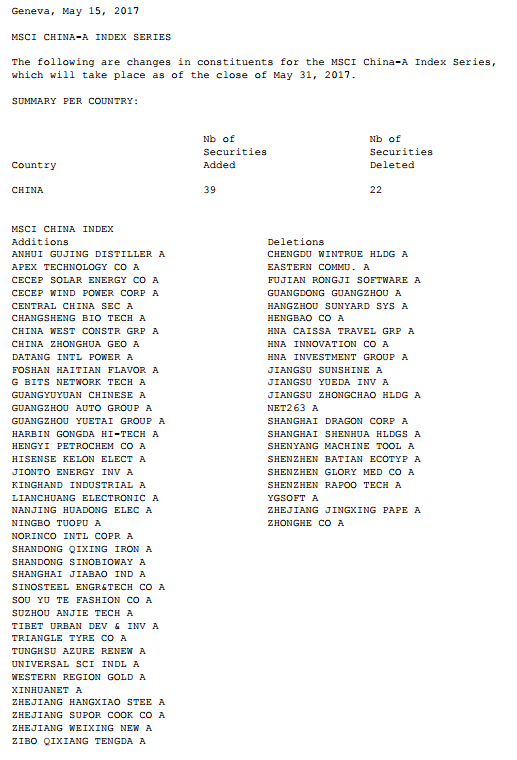 据MSCI官网消息,MSCI中国A股指数大调整新增广汽集团、海天味业、大唐发电、中原证券等39只成份股,剔除凯撒旅游、云图控股、东方通信等22只,此次变动将在5月31日收盘后生效。名单如下: