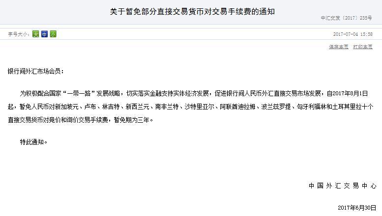 据周二(7月4日)中国外汇交易中心发布通知称,自2017年8月1日起,暂免人民币对新加坡元、卢布、林吉特、纽元、南非兰特、沙特里亚尔、阿联酋迪拉姆、波兰兹罗提、匈牙利福林和土耳其里拉10个直接交易货币对竞价和询价交易手续费,暂免期为3年。