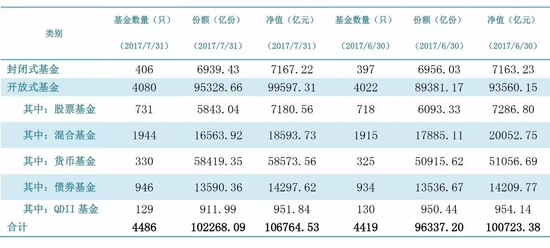 股票型基金6月底规模为7286亿元,7月底变为7180亿元,规模减少106亿元,增幅为-1.4%!
