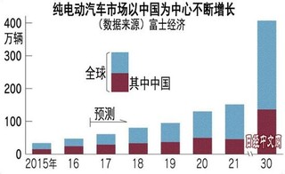 中国振兴电动汽车的国家战略对企业破格的扩张政策构成了支撑。中国曾提出到2020年,纯电动汽车和插电式混合动力汽车生产能力达到200万辆、累计产销量超过500万辆。严格实施乘用车燃料消耗量限值标准,提高重型商用车燃料消耗量限值标准,研究新车碳排放标准。继英法之后,也开始讨论在今后禁止汽油车。日本富士经济的调查显示,中国占全球电动乘用车销量份额的51%。这些车辆中大部分被认为搭载了国产电池,旺盛的内需对电池厂商构成了支撑。