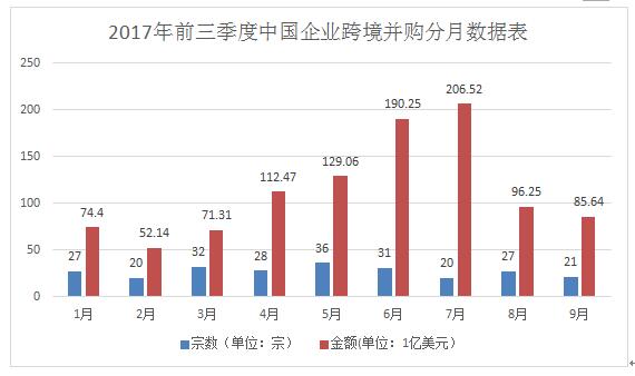 2017年前三季度,监测录入的中国企业跨境并购交易共有242宗,其中207宗披露了交易金额,总计约为1018亿美元。按宗数计算,前三季度中的5月、3月和6月监测到的跨境并购交易更多,分别录入了36宗,32宗和31宗。按金额计算,前三季度中的7月、6月和5月进行的跨境并购交易更多,披露的总交易金额分别约为207亿美元、190亿美元和113亿美元。