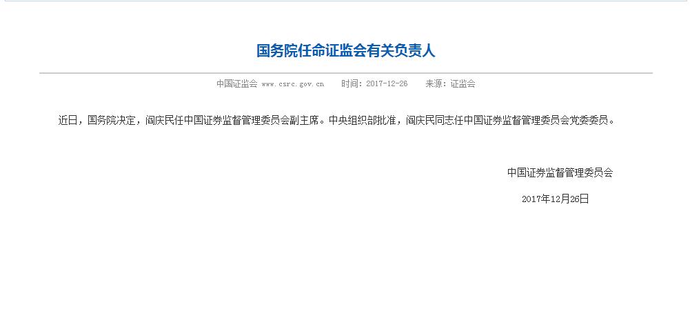 近日,国务院决定,阎庆民任中国证券监督管理委员会副主席。中央组织部批准,阎庆民同志任中国证券监督管理委员会党委委员。