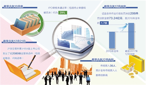 截至12月中旬的统计数据显示,证监会2017年以来共作出行政处罚决定206件,罚没款金额73.24亿元,是2016年全年的1.7倍;市场禁入36人,预计全年市场禁入人数将再创历史新高。此外,9月下旬以来,监管部门开展了对23家IPO企业的现场检查;截至今年10月底,IPO审核未通过率(包括终止审查和被否决)约为29%;截至12月21日,今年以来沪深交易所累计对A股上市公司发出了超2080份监管类函件(包括监管函、问询函等),严监管取得明显成效。