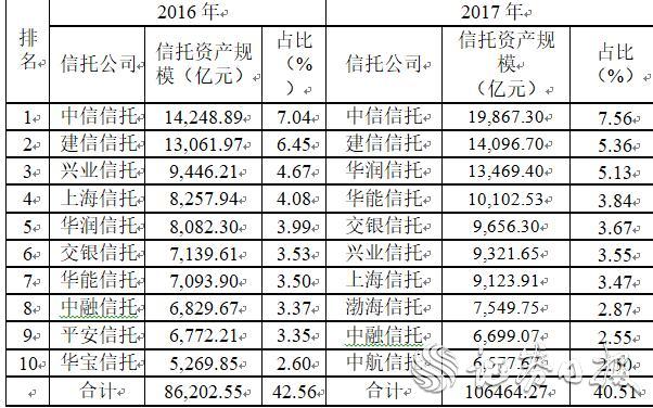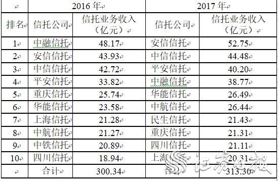 具体到各家信托公司的信托业务收入排名方面,安信信托、中信信托和平安信托的信托业务收入都超过了40亿元。其中,安信信托以52.75亿元跃居榜首位置,中信信托紧随其后。排名前10位信托公司的信托业务收入总额占全行业的比重是38.32%,较2016年的40.21%有所降低。