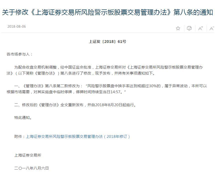 金融界网站8月6日讯 上交所发布关于修改《上海证券交易所风险警示板股票交易管理办法》第八条的通知,《管理办法》第八条第二款修改为:“风险警示股票盘中换手率达到或超过30%的,属于异常波动,本所可以根据市场需要,对其实施盘中临时停牌,停牌时间持续至当日14:57。”