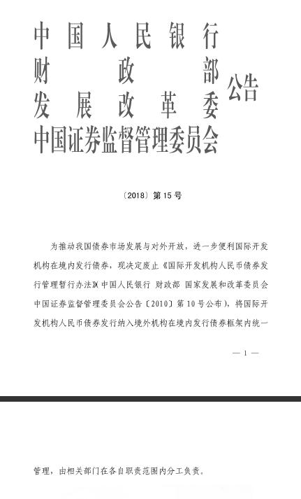 为促进债券市场对外开放,规范境外机构债券发行,经国务院同意,中国人民银行、财政部近日联合发布《全国银行间债券市场境外机构债券发行管理暂行办法》(中国人民银行财政部公告〔2018〕第16号)。同时,《国际开发机构人民币债券发行管理暂行办法》(中国人民银行财政部国家发展和改革委员会中国证券监督管理委员会公告〔2010〕第10号)正式废止。