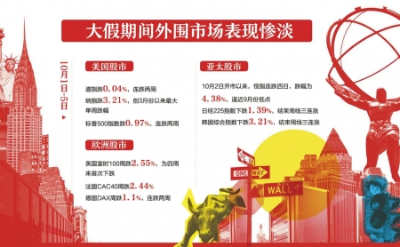 国庆长假期间,欧美市场股指收跌,纳斯达克指数本周累跌3.2%,创3月份以来最大单周跌幅。港股市场方面,恒生指数本周累计下跌4.38%,创出近8个月最大周跌幅。中兴通讯、联想集团股价遭遇单日大幅下跌。追踪24个新兴市场国家中大盘股的MSCI新兴市场指数本周下跌3.8%。