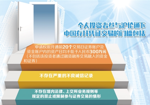 个人投资者参与中国存托凭证交易的门槛包括:申请权限开通前20个交易日证券账户及资金账户内的资产日均不低于人民币300万元(不包括该投资者通过融资融券交易融入的资金和证券);不存在严重的不良诚信记录;不存在境内法律、上交所业务规则等规定的禁止或限制参与证券交易的情形。