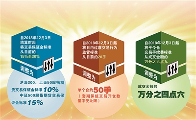 此次调整主要包括三个方面:一是自2018年12月3日结算时起,将沪深300、上证50股指期货交易保证金标准统一调整为10%,中证500股指期货交易保证金标准统一调整为15%;二是自2018年12月3日起,将股指期货日内过度交易行为的监管标准调整为单个合约50手,套期保值交易开仓数量不受此限;三是自2018年12月3日起,将股指期货平今仓交易手续费标准调整为成交金额的万分之四点六。