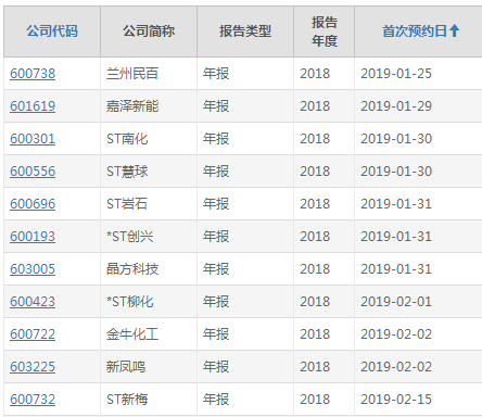 据记者初步统计,2019年农历春节(2月5日)之前,沪市将有10家上市公司抢先披露年报。其中包括兰州民百、嘉泽新能、晶方科技、金牛化工和新凤鸣,以及ST南化等5家ST公司。(祁豆豆)