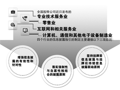 新三板市场增量改革正循序渐进展开。近日,全国股转公司发布了专业技术服务业、零售业、互联网和相关服务业以及计算机、通信和其他电子设备制造业四个行业的信息披露指引,进一步完善差异化、分行业信息披露制度,创新层公司仍是规范的重点。